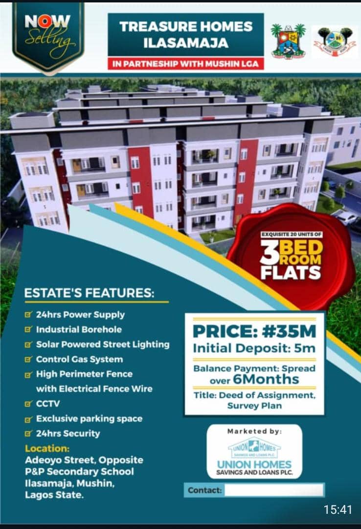 | Treasure Homes is a 3 Bedroom luxury flats made up of 48 units located at Ilasamaja, introduced to us by Korp Properties Limited, a Real Estate Marketing firm and being developed by Arcview Investment Limited and being marketed by Union Homes Savings and Loans Plc.